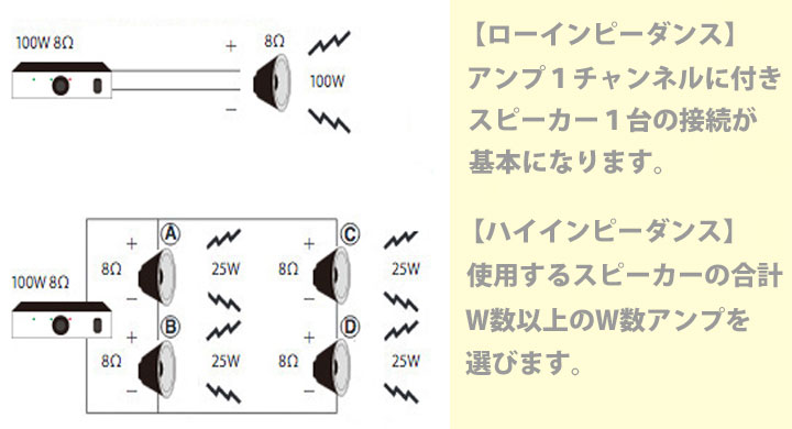 BGM用サウンドシステムには、一般にローインピーダンス方式が高音質を得やすくて好ましいとされていますが、先述したように配線距離が長くなると音質が劣化するため注意が必要です。
